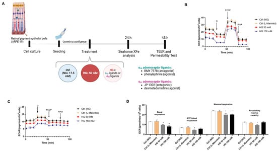 Effect of high glucose (HG) on OCR and ECAR in ARPE-19 cells. (O: oligomycin; FCCP: carbonyl cyanide 4-(trifluoromethoxy) phenylhydrazone; R/AA: rotenone and antimycin A). (A) Experimental design for the evaluation of ARPE-19 mitochondria activity and barrier permeability (NG = normal glucose; HG = high glucose). Cells exposed to NG medium were used as control group, while treatment with elevated glucose levels (HG, 50 mM) was employed to mimic DR pathogenesis. ARPE-19 cells were also co-treated with HG and α1DR or α2CR ligands to study the role of the receptors in DR. Seahorse XFe analysis and TEER along with a NaF permeability test were, respectively, carried out after 24 and 48 h of treatment. Exposure of ARPE-19 cells to HG (50 and 150 mM) for 24 h decreased OCR (B) and ECAR (C) in a concentration-dependent manner. Additional parameters calculated from these curves show that several bioenergetics markers were significantly (p < 0.05) affected by exposure to HG compared to control cells (D). Values are reported as mean ± SD; n = 4. Data were analyzed by one-way and two-way ANOVA and the Tukey post hoc test for multiple comparisons. * p < 0.05 vs. control (Ctrl).