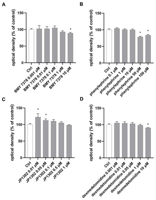 Effect of α1D and α2C receptors agonists/antagonists on ARPE-19 cell viability in NG (MTT assay). Treatment with the α1DR antagonist (BMY 7378 0.001–1 µM) (A) and agonist (phenylephrine 0.1–10 µM) (B) did not reduce cell viability. Only the higher tested concentrations of BMY 7378 (10 µM) and phenylephrine (50–100 µM) significantly (p < 0.05) affected ARPE-19 viability compared to untreated cells (Ctrl). α2CR antagonist, JP 1302 (0.01–1 µM) (C), and agonist, dexmedetomidine (0.001–1 µM) (D), were tolerated by ARPE-19 cells. Dexmedetomidine at 10 µM led to a significant (p < 0.05) reduction in cell viability as compared to control cells (D). Values are reported as mean ± SD; n = 4. Data were analyzed by one-way ANOVA and the Tukey post hoc test for multiple comparisons. * p < 0.05 vs. control.