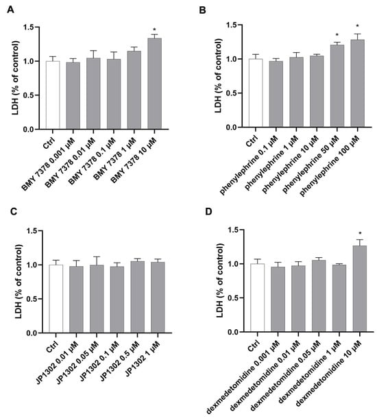 Preliminary studies were carried out to evaluate the cell viability after 24 h of treatment with α1DR and α2CR ligands. Specifically, an MTT assay was used to assess the cytotoxicity on ARPE-19 cell growth in NG (17.5 mM glucose) of α1DR ligands (BMY 7378 0.001–10 µM and phenylephrine 0.1–100 µM) and α2CR ligands (JP 1302 0.01–1 µM and dexmedetomidine 0.001–10 µM). We found that the α1DR antagonist BMY 7378, at concentrations of 0.001–1 µM, was tolerated by ARPE-19, whereas treatment with BMY 7378 10 µM led to a significant (p < 0.05) reduction in cell viability compared to control cells (Figure 2A). Exposure to phenylephrine at 0.1–10 µM did not reduce cell viability. However, phenylephrine at the higher tested concentrations (50 and 100 µM) significantly (p < 0.05) decreased ARPE-19 viability as compared to untreated cells (Figure 2B). Concerning α2CR ligands, exposure to the antagonist, JP 1302 (0.01–1 µM), did not affect cell viability compared to control cells. In detail, treatment with JP 1302 at 0.001 and 1 µM led to a significant (p < 0.05) increase in cellular viability (Figure 2C). The α2CR agonist (dexmedetomidine 0.001–1 µM) was tolerated by ARPE-19. However, dexmedetomidine at 10 µM led to a significant (p < 0.05) reduction in cell viability compared to control cells (Figure 2D). Since the MTT assay primarily measures the metabolic activity of the cells, we evaluated the cytotoxicity of α1DR and α2CR ligands on ARPE-19 cells also by using the lactate dehydrogenase (LDH) release assay (Figure 3). These data confirmed the results generated by MTT (Figure 2).