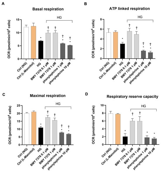 Effect of α1DR agonist and antagonist on bioenergetics parameters in ARPE-19 cells exposed to HG. HG (50 mM) significantly (p < 0.05) depressed the bioenergetics parameters quantified from the results of Mito Stress Test. Pharmacological blockade of α1D receptor with BMY 7378 (0.1 and 1 µM) restored HG-impaired basal (A), ATP-linked (B), and maximal (C) respiration. In contrast, exposure to the α1D receptor agonist phenylephrine (1 and 10 µM) significantly (p < 0.05) decreased the basal (A), ATP-linked (B), and maximal (C) respiration compared to HG. Treatment with the α1DR antagonist BMY 7378 (0.1 and 10 µM) also significantly (p < 0.05) improved the respiratory reserve capacity compared to HG alone (D). Phenylephrine (1 and 10 µM), however, did not significantly modify the HG-mediated decrease in respiratory reserve capacity (D). Values are reported as mean ± SD; n = 4. Data were analyzed by one-way ANOVA and the Tukey post hoc test for multiple comparisons. * p < 0.05 vs. control (Ctrl); † p < 0.05 vs. HG.