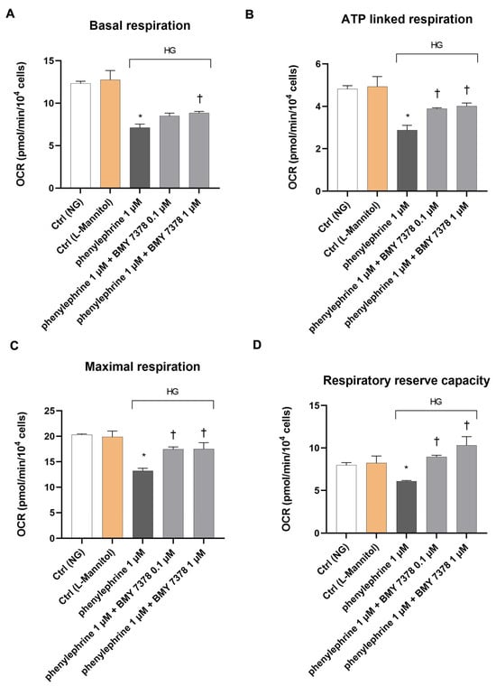 Effect of a combination of α1DR agonist and antagonist on bioenergetics profiles in ARPE-19 cells exposed to HG levels. Co-treatment of ARPE-19 cells exposed to HG (50 mM) with phenylephrine (1 μM) + BMY 7378 (0.1 or 1 µM) for 24 h significantly (p < 0.05) reversed the reduction in basal (A), ATP-linked (B), and maximal (C) respiration induced by phenylephrine alone. Similar results were obtained when looking at the respiratory reserve capacity (D). Values are reported as mean ± SD; n = 4. Data were analyzed by one-way ANOVA and the Tukey post hoc test for multiple comparisons. * p < 0.05 vs. control (Ctrl); † p < 0.05 vs. phenylephrine 1 μM.