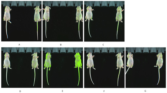 Whole-body imaging at various time intervals: 10 min (A), 30 min (B), 1 h (C), 3 h (D), 6 h (E), 24 h (F), and 48 h (G). Mouse on the left was injected with saline and mouse on the right with epirubicin.
