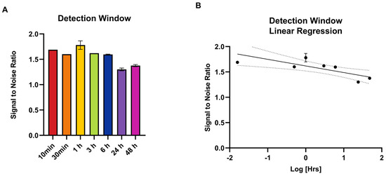 The time points from 10 min to 3 h demonstrated a high signal plateau, with an optimal signal-to-noise ratio observed at 1 h (1.78) (Figure 2A), followed by logarithmic decay and subsequent signal drop-off after 6 h (Figure 2B).
