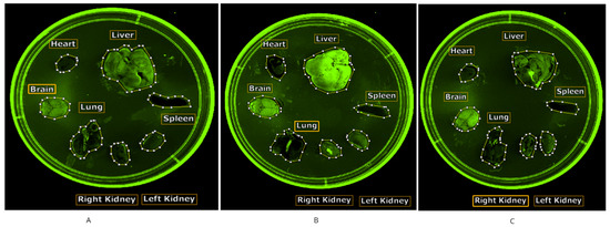Localized and transient variations in vasculature dilation could potentially account for the seemingly variable distribution of signals at the whole-body level. Unlike Subpart A1, a poor signal was observed in the Ex 580 nm/Em 600 nm condition, likely due to the difference between in vivo and ex vivo imaging. A high background incongruent with quantification was noted in the Ex 540 nm/Em 550 nm condition. Workflow and image analysis led to an update to the workflow, where liquids (blood and bone marrow isolate) were routed to the plate reader for analysis.