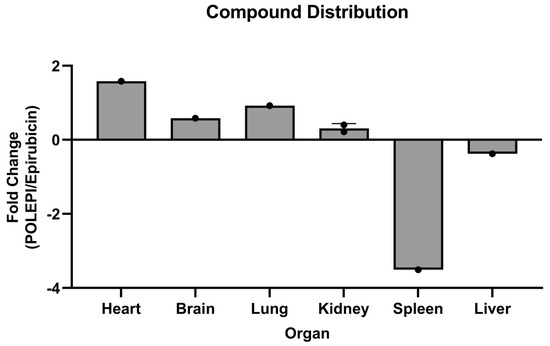 Epirubicin levels were 3.5- and 0.38-fold higher in the spleen and liver, respectively (Figure 6). The distribution of POLEPI versus epirubicin revealed a distribution 1.58-fold higher in the heart, 0.58-fold higher in the brain, 0.92-fold higher in the lung, and 0.22-fold higher in the kidney, but 3.51-fold lower in the spleen and 0.38-fold lower in the liver (Figure 6).