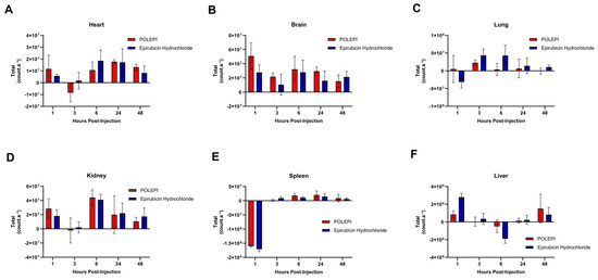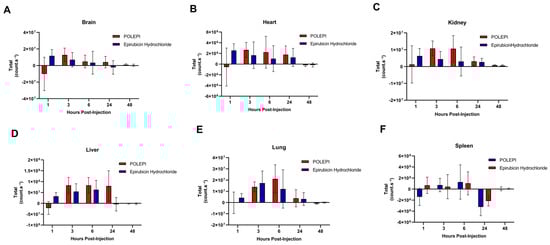 Biodistribution of POLEPI vs. epirubicin at different time points in tissues in tumored mice: brain (A), heart (B), kidney (C), liver (D), lung (E), and spleen (F). The data are expressed as mean ± SD.