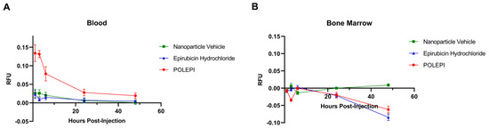 Overall, the fluorescence of POLEPI and epirubicin was found to be low in blood, with slightly higher fluorescence detected in the POLEPI-treated groups compared to the epirubicin-treated groups (Figure 9A). POLEPI detection peaked at 1 h post-dose and then declined over time at each time point. No fluorescence was detected in the bone marrow (Figure 9B). Interestingly, in many cases, the PBS control sample exhibited a higher background signal than the actual bone marrow samples. Neither POLEPI nor epirubicin was distributed in the bone marrow.