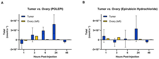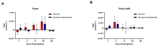 Distinct differences were noted in the biodistribution of POLEPI within the tumor compared to epirubicin (Figure 11A). POLEPI exhibited accumulation starting at 3 h post-dose, reaching a peak at 24 h. Over the 48 h period, a significantly higher accumulation of counts/s was observed in the tumor following POLEPI administration compared to epirubicin. However, both POLEPI and epirubicin appeared to be cleared from the tumors after 48 h. Furthermore, both POLEPI and epirubicin were cleared from the healthy left ovary by 6 h post-dose (Figure 11B). Interestingly, compared to the left healthy ovary, there were higher counts of both POLEPI and epirubicin observed in the tumor (Figure 12), indicating preferential uptake of POLEPI within the tumor tissue.