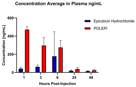 Biodistribution of POLEPI vs. epirubicin in the plasma at different timepoints in tumored mice. The data are expressed as mean ± SD.