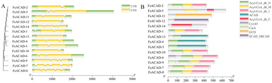 The intron distribution of the FsACAD genes was verified by cDNA cloning and sequencing and visualized using TBtools [27]. Except for FsACAD-13, which is intron-free, all FsACADs contain one to five introns (Figure 1A). Protein domain analysis showed that two of the FsACADs each harbor one type of domain (SCAD-SBCAD, 1; GCD, 1), four FsACADs harbor two types of domains (Acyl-CoA_dh_N + Acyl-CoA_dh_C, 1; Acyl-CoA_dh_N + ACAD, 3), there are five FsACAD proteins with three types of domains (Acyl-CoA_dh_N + Acyl-CoA_dh_M + Acyl-CoA_dh_l) and two FsACADs with four domains (one Cyt-b5 or one CaiA plus three others) (Figure 1B). The structure prediction revealed that all ACAD proteins have similar tertiary structures (Figure S1).