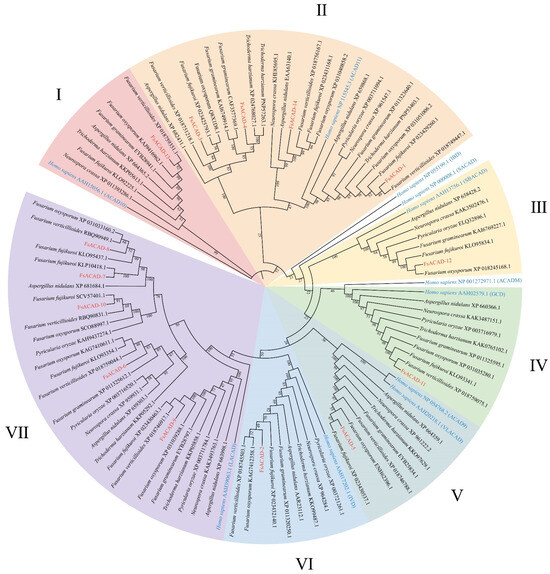 Phylogenetic relationship of acyl-CoA dehydrogenases (ACADs). The phylogenetic tree was constructed using the maximum likelihood method with 5000 bootstraps and adjusted using the online tool iTOL. FsACADs are marked in red, and ACADs from Homo sapiens are marked in blue. Reference to Homo sapiens, the phylogenetic tree was delineated seven groups (I to VII), encompassing ACAD10, ACAD11, SBACAD (Short/branched-chain acyl-CoA dehydrogenase), GCD (Glutaryl-CoA dehydrogenase), ACAD9/VLACAD, IVD (Isovaleryl-CoA dehydrogenase), and LACAD (long-chain-specific acyl-CoA dehydrogenase).