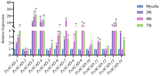 Expression of Fusarium sacchari acyl-CoA dehydrogenase genes during infection. Fusarium sacchari FF001 was inoculated onto sugarcane leaves for 24, 48, and 72 h, and the relative expression levels of each ACAD gene were measured. Mycelium of in vitro culture was used as the control. Each treatment consists of three biological replicates, of which there are three technical replicates. Differential analysis was performed using SPSS, * indicates p < 0.05; ** indicates p < 0.01.