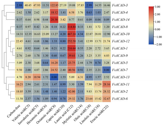 The expression of all 14 FsACADs was induced by at least one type of fatty acid. While expression in 13 of the 14 FsACADs (FsACAD-1 to FsACAD-13) was induced by lauric acid, FsACAD-3 could be induced by all of the fatty acids tested. However, a clear specificity between FsACADs and fatty acids was observed: FsACAD-14 was induced by octanoic acid and capric acid but suppressed by all other fatty acids; FsACAD-8 was induced by lauric acid and linoleic acid but suppressed by myristic acid, valeric acid, isovaleric acid, octanoic acid, and capric acid. Furthermore, FsACAD-2, FsACAD-6, and FsACAD-11 were preferentially induced by long-chain fatty acids (Figure 4).