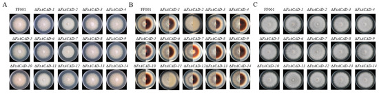 Growth of mutants of Fusarium sacchari acyl-CoA dehydrogenase genes in different media. (A) front view of colonies on PDA; (B) colonies on MM. Front view (left) and back view (right) are presented for each colony; (C) front view of colonies on CM. Images were taken five days after cultivation. The petri dish is 90 mm in diameter.