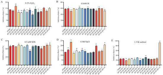 Growth phenotype of Fusarium sacchari acyl-CoA dehydrogenase gene mutants under stress conditions. (A–E) Inhibition rates of FF001 and FsACAD mutant strains on CM plates with 0.1% H2O2, 0.5 mM CR, 0.5 mM SDS, 0.5 M NaCl, and 1.5M sorbitol. Error bars represent standard deviation, and asterisks indicate significant differences in inhibition ratio between FF001 and mutant strains (* p < 0.05; ** p < 0.01).