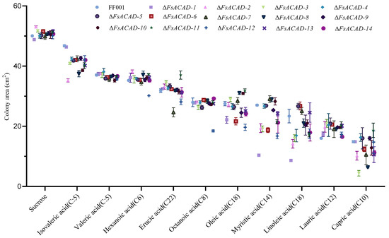 The colony size of the wild type was 29.6% smaller in medium with hexanoic acid rather than sucrose as the sole carbon source. ΔFsACAD-12 was the only mutant with a colony size smaller than that of the wild type (14.35% reduction) (Figure 7 and Table S2).