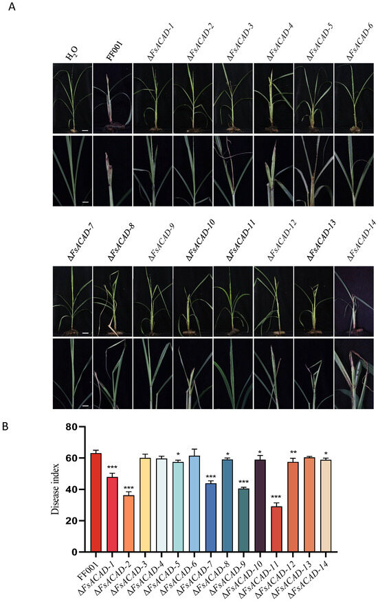 ΔFsACAD mutants of whole sugarcane plants were assayed for virulence and disease severity (Figure 9A). Disease index (DI) values ranging from 69.57% to 96.15% were recorded for the tested strains and 0% for the mock group. The symptoms induced by ΔFsACAD-3, ΔFsACAD-4, ΔFsACAD-6, and ΔFsACAD-13 were most severe, with disease index (DI) values of 60 to 61, similar to the wild-type FF001 (DI = 63). Mutants ΔFsACAD-5, ΔFsACAD-8, ΔFsACAD-10, ΔFsACAD-12, and ΔFsACAD-14 exhibited less severe symptoms with DIs of 57–59; ΔFsACAD-1, ΔFsACAD-7, and ΔFsACAD-9 displayed mild symptoms with DIs of 40–47. The most attenuated mutants were ΔFsACAD-11 and ΔFsACAD-2, with DIs of 29 and 36, followed by ΔFsACAD-9, ΔFsACAD-7, and ΔFsACAD-1, with DIs of 40, 44, and 48 (Figure 9B).