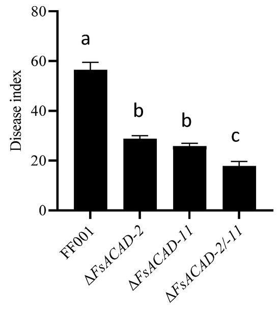 Comparison of virulence between the single and double mutants of Fusarium sacchari acyl-CoA dehydrogenase genes FsACAD-2 and FsACAD-11. The inoculations were repeated three times, with 15–20 plants for each. Same letters indicate no significant differences (p < 0.05).