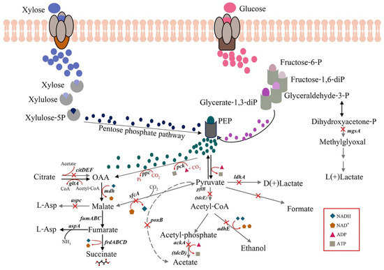 A schematic illustration of succinic acid production pathway by E. coli KJ122. The cross signs represent the deletion of certain genes (adapted from [11]).