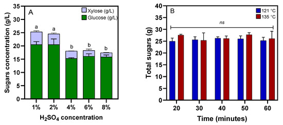 Effects of different H2SO4 concentrations for pretreatment of MWOP at 121 °C for 30 min (A) and effect of pretreatment time for pretreatment of MWOP at 121 °C and 135 °C (B) on total released fermentable sugars (glucose and xylose) from the acid-pretreated MWOP after enzymatic hydrolysis by crude cellulase. Each column represents the mean ± SD from three independent replicates. The different alphabet (a or b) above each column indicates statistical significance of differences between the mean values of the total released sugars among different treatments (p < 0.05). Data considered not significant among different treatments are marked ns (p > 0.05).
