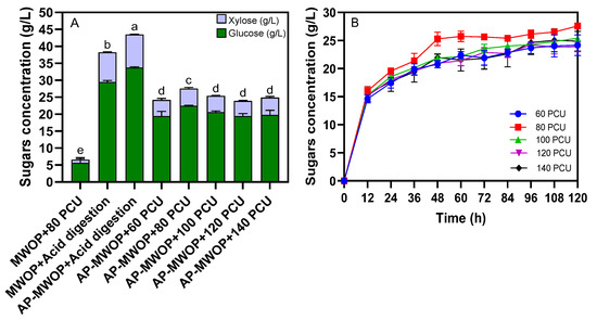 Effect of strong acid digestion and crude cellulase loadings (PCU: protein centered unit) used during enzymatic hydrolysis of 50 g/L MWOP (untreated) and AP-MWOP on total released sugars (glucose and xylose) (A), and total released sugars from 50 g/L AP-MWOP hydrolyzed with different crude cellulase loadings at different time intervals (B). Each column represents the mean ± SD from three independent replicates. The different alphabet above each column indicates statistical significance of differences between the mean values of the total released sugars among different treatments (p < 0.05).