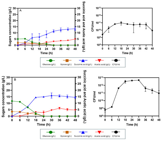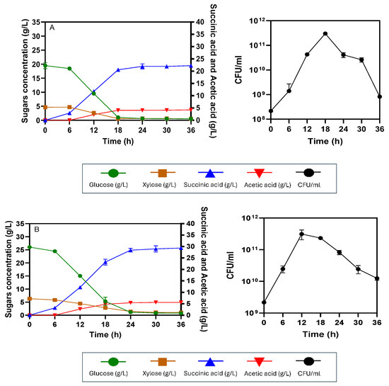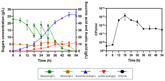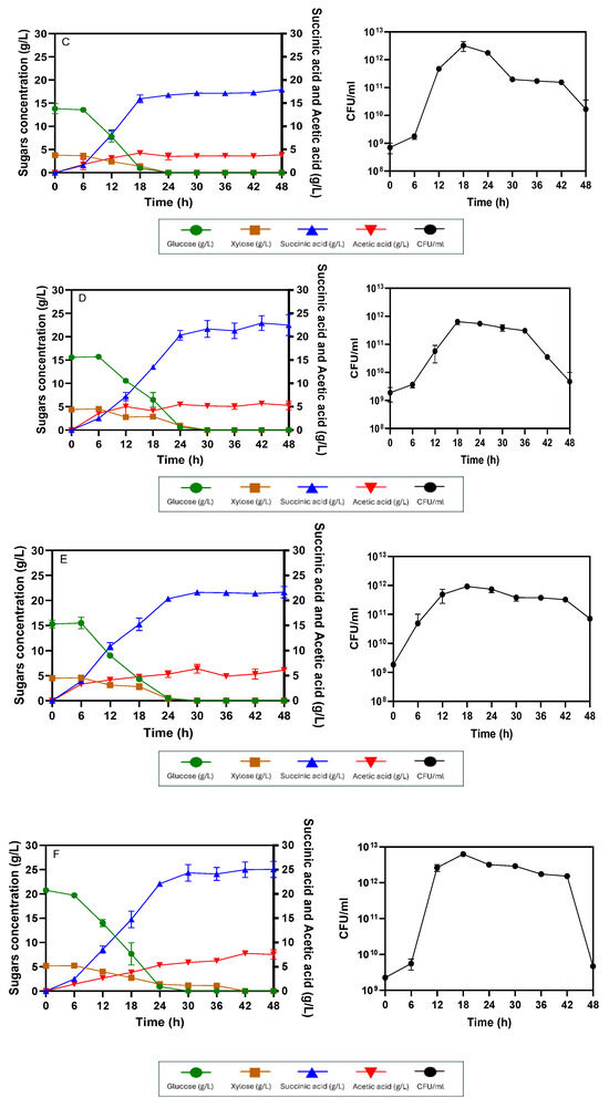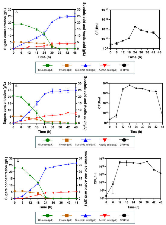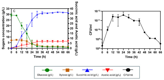Succinic acid production via SHF by E. coli KJ122 using different concentrations of AP-MWOP. (A) 50 g/L AP-MWOP, (B) 70 g/L AP-MWOP, and (C) 100 g/L AP-MWOP. Three independent replications were performed on each test, and the means were reported with the standard deviation (SD).