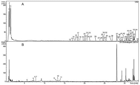 UHPLC-CAD (A), and UV (λ = 255 nm (B)) chromatograms of the extract from the fruit of S. chinensis. Numbers above the chromatic peaks correspond to those from Table 1.