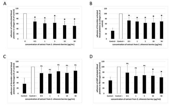 Effect of the extract from S. chinensis berries (at concentrations 0.5, 1, 5, 10, and 50 μg/mL) on the adhesion of unstimulated platelets to collagen (A), thrombin-activated platelets to collagen (B), thrombin-activated platelets to fibrinogen (C), and ADP-activated platelets to fibrinogen (D) (n = 9). In the graphs, platelet adhesion is expressed as a percentage of the ‘Control’ sample (blood platelets without the tested extract) (A), or the ‘Control +’ sample (platelets stimulated by agonist with no added extract) (B–D). ‘Control -‘ samples are unstimulated blood platelets. The data are expressed as means ± SD. The results were considered significant at p < 0.05 (* p < 0.05, ns—not significant). The differences between controls were significant (p < 0.001 (B,D), p < 0.01 (C)).