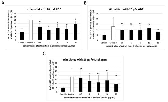 Effect of the extract from S. chinensis berries (at concentrations 0.5, 1, 5, 10, and 50 μg/mL) on the exposition of the active form of GPIIb/IIIa on 10 µM ADP-stimulated blood platelets (A), 20 µM ADP-stimulated blood platelets (B), and 10 µg/mL collagen-stimulated blood platelets (C) in whole blood samples. Blood platelets were distinguished based on the exposition of CD61. For each sample, 5000 CD61-positive objects were acquired. For the assessment of GPIIb/IIIa exposition, samples were labeled with fluorescently conjugated monoclonal antibody PAC-1/FITC. Results are shown as the percentage of platelets binding PAC-1/FITC. Data represent the means ± SD. The blood samples were drawn from 6 healthy volunteers. ‘Control -‘samples are unstimulated blood platelets, ‘Control +’ samples are platelets stimulated by agonist with no added extract. The activity of the tested extract was compared to the ‘Control +’ sample. The differences between controls were significant (p < 0.01 (A), p < 0.05 (B,C)). The results were considered significant at p < 0.05 (* p < 0.05, ns—not significant).