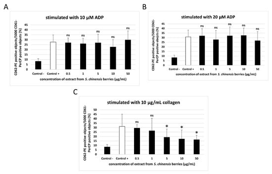 Effect of the extract from S. chinensis berries (at concentrations 0.5, 1, 5, 10, and 50 μg/mL) on the exposition of P-selectin on 10 µM ADP-stimulated blood platelets (A), 20 µM ADP-stimulated blood platelets (B), and 10 µg/mL collagen-stimulated blood platelets (C) in whole blood samples. Blood platelets were distinguished based on the exposition of CD61. For each sample, 5000 CD61-positive objects were acquired. For the assessment of P-selectin exposition, samples were labeled with fluorescently conjugated monoclonal antibody CD62P/PE. Results are shown as the percentage of platelets expressing CD62P. Data represent the means ± SD. ‘Control -‘samples are unstimulated blood platelets, ‘Control +’ samples are platelets stimulated by agonist with no added extract. The activity of the tested extract was compared to the ‘Control +’ sample. The differences between controls were significant (p < 0.001 (A,B), p < 0.05 (C)). The results were considered significant at p < 0.05 (* p < 0.05, ns—not significant).