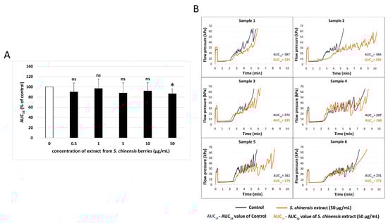 Effect of the extract from S. chinensis berries (at concentrations 0.5, 1, 5, 10, and 50 μg/mL) on platelet plug formation in whole blood (n = 6) (A). The samples were analyzed with T-TAS PL-chip, at the shear stress rates of 1500/s. The results are calculated as AUC10 (area under the curve). In the graphs, AUC10 is expressed as a percentage of the control sample (blood without the tested extract). The data are expressed as means ± SD. The results were considered significant at p < 0.05 (* p < 0.05, ns—not significant). (B) shows changes in pressure that were recorded within the PL-chip in each sample at the highest concentration of the extract (50 μg/mL).