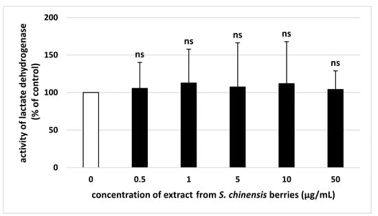 Effect of the extract from S. chinensis berries (at concentrations 0.5, 1, 5, 10, and 50 μg/mL) on the activity of lactate dehydrogenase (n = 6). The results are expressed as a percentage of the control sample. The data are expressed as means ± SD. The results were considered significant at p < 0.05 (ns—not significant).