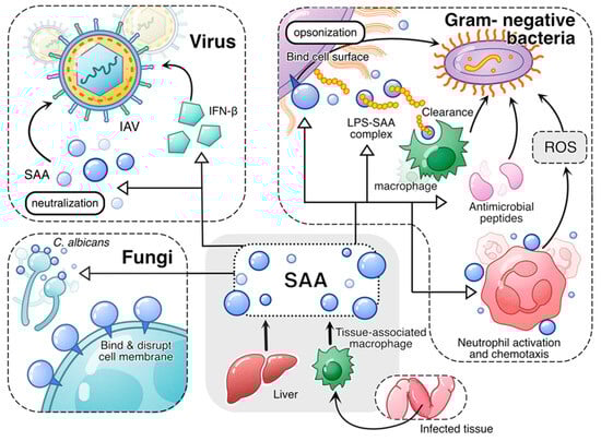 An overview of the antimicrobial activities of acute-phase SAA. Both liver-derived SAA and tissue-derived SAA play antimicrobial roles in infection. In viral infection, acute-phase SAA induces antiviral cytokines such as IFN-β and neutralizes virus, thus conveying antiviral activity. In fungal infection, acute-phase SAA binds and disrupts fungal cell membrane, thus killing the fungal cells. In infections caused by Gram-negative bacteria, acute-phase SAA employs multiple mechanisms to mitigate bacterial growth and spread. First, acute-phase SAA binding to bacterial cell wall serves as opsonin that promotes bacteria clearance by phagocytes. Secondly, acute-phase SAA binds and neutralizes LPS, facilitating its clearance by macrophages. Additionally, acute-phase SAA promotes expression of antimicrobial peptides. Finally, acute-phase SAA promotes phagocyte activation, leading to increased bactericidal activities including production of superoxide.