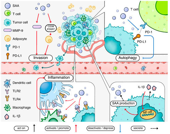 One mechanism employed by SAA in regulating cancer immunity is to predispose cancer cells, such as breast cancer cells, in an inflammatory tumor environment. This action may be explained by the ability of inflammatory factors such as IL-1β to induce NF-κB activation, which contributes to the induced expression of acute-phase SAA. The expressed acute-phase SAA then activates TLR1/TLR2 to induce an inflammatory tumor environment [26,104]. In cell-based studies, an overexpression of acute-phase SAA or the deletion of SAA genes are found to influence autophagy, with attenuated autophagy in human SAA1-overexpressed cells and enhanced autophagy with the deletion of the SAA genes from the cell lines [105,106]. In addition, adipocyte reprogramming associated with triple-negative breast cancer aggressiveness is influenced by human SAA1 through two of its receptors, CD36 and P2XR7 [107].