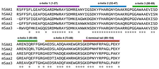 Among the acute-phase SAA proteins, human SAA1 and SAA2 are hepatically produced and structurally similar (94% sequence identity). Likewise, mouse Saa1 and Saa2 are 93% identical in a primary sequence [30,121]. The similarity between human SAA1 and the three mouse acute-phase Saa proteins is lower, at 73–74% [121]. The aligned sequences of the human and mouse acute-phase SAA proteins are shown in Figure 4.