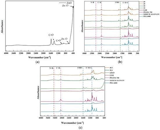 In the next step, we analyzed the chemical structure of hydrogel materials prepared from SA, PEG 6000, and PEGDA 700, with the addition of substances such as synthesized ZnO microparticles and GSH (Figure 3b,c). Characteristic absorption bands corresponding to the compounds used in the syntheses were observed on the spectra. All spectra displayed a peak at 1100 cm−1 , which corresponds to the vibrations of the C–O–C bond found in PEG 6000 [44]. In addition, all materials showed a peak of 2876 cm−1, which belongs to the C–H group vibrations and originated from PEGDA 700 [45]. Furthermore, signals corresponding to COO− stretching vibrations originating from SA around 1636 cm−1 were also observed on all polymeric hydrogel spectra, including those containing ZnO microparticles [46]. An analogous situation occurred in the case of GSH, where vibrations of N–H groups were located in the wavenumber range of 3200–3500 cm−1 [47]. Importantly, no absorption bands corresponding to ZnO-derived functional group vibrations were identified in the spectra of polymeric hydrogels containing ZnO microparticles (Figure 3c). This is due to the fact that a small amount of it was introduced, compared to the rest of the polymeric components.