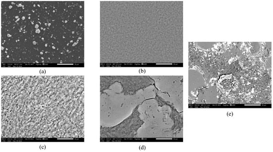 We assessed the homogeneity and morphology of the prepared ZnO microparticles as well as polymeric hydrogels using scanning electron microscopy (SEM). It can be observed in Figure 4a that the obtained ZnO microparticles have a tendency to agglomerate. A comparison of the polymer matrices without GSH and ZnO microparticles (Figure 4b,c) and those obtained by introducing GSH (Figure 4d) shows that with the incorporation of GSH, the surface of the materials becomes less homogeneous, with a tendency to crack. Figure 4e shows the morphology of sample 40.1. obtained by introducing the highest concentration of GSH and ZnO microparticles. In the microphotographs, both cracks and lack of homogeneity were observed, which was related to the introduction of GSH, and agglomerates of ZnO microparticles were also visible.