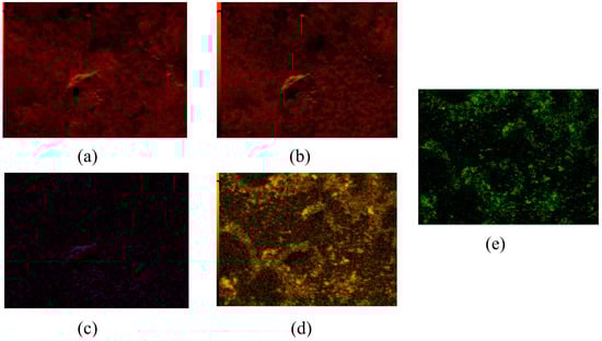 Elemental EDS microanalysis and determination of elements on the surface of material 40.1 (a) carbon, (b) oxygen, (c) nitrogen, (d) sulfur, (e) zinc.