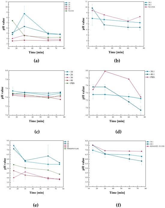 Measured pH values during incubations in (a,b) distilled water, (c,d) PBS, (e,f) Ringer’s fluid.
