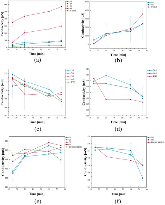 Measured conductivity values during incubation in (a,b) distilled water; (c,d) PBS; (e,f) Ringer’s fluid.