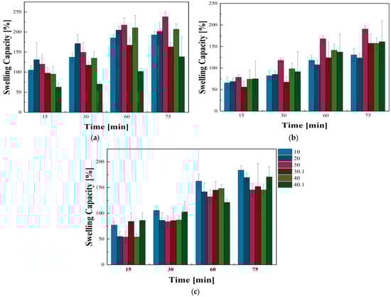 Remarkably, the results of tests conducted in Ringer’s fluid significantly differ from those obtained in other media. In Ringer’s fluid, all samples except samples no. 30 and 40 showed swelling capacity above 150%, of which, for sample 10, the capacity was 183.5 ± 9.11%. To summarize, the variations in the swelling capacity of the materials resulting from the measurement solution used result from the chemical composition of the respective fluids. Pure distilled water does not contain ions that can react with the material. PBS has sodium (Na+) and chloride ions (Cl−), which maintain the isotonicity of the solution. Furthermore, it contains phosphates, which provide the solution with a buffering nature. Besides Na+ and Cl− ions, Ringer’s fluid contains calcium (Ca2+) and potassium ions (K+), giving it the character of a plasma, further influencing the test results.