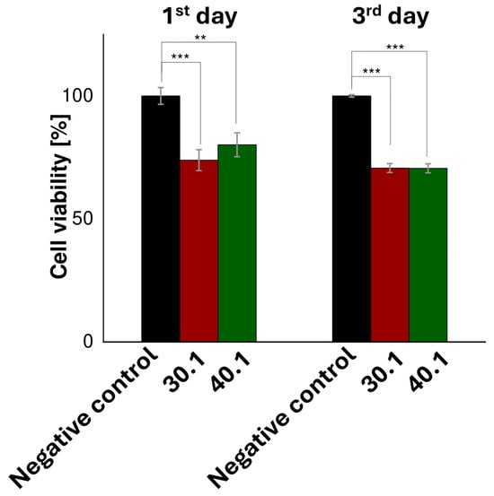 To assess the toxicity of the prepared materials, indirect cytotoxicity tests were conducted, where extracts from materials incubated in cellular media were analyzed. These experiments followed the guidelines set by ISO 10993-5 [37]. After incubating the materials in a culture medium, Dullbecco’s Modified Eagle’s Medium (DMEM) for 24 h, extracts were tested. Mouse fibroblast (L929) cells were exposed to these extracts for another 24 and 72 h, and cytotoxicity was evaluated through resazurin reduction. The results indicated that after 24 and 72 h of exposure to the prepared extracts, cell viability remained above 70% compared to the negative control, which was DMEM. For samples no. 30.1 and 40.1 on the 1st day of the experiment, cell viability is equal to 73.88 ± 4.27% and 80.13 ± 4.84%, respectively. On the 3rd day of the experiment, cell viability for sample no. 30.1 and 40.1 was 70.67 ± 1.79% and 70.56 ± 1.83%, respectively (Figure 9). Common sources of cytotoxicity include residues from organic solvents used in synthesis, intermediate products generated during synthesis, degradation products, and the additives used to modify the polymer [48].