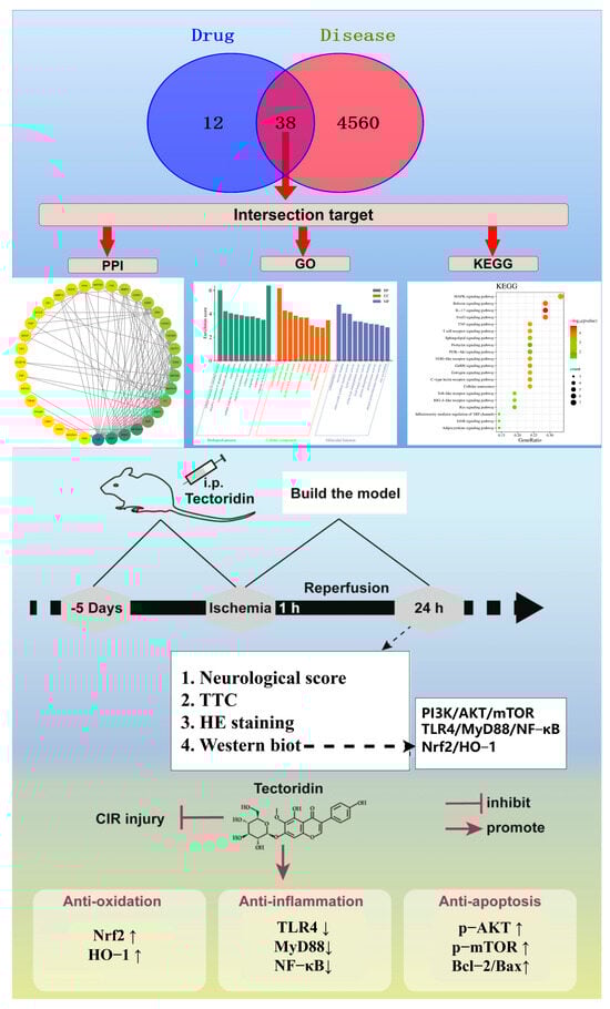 Investigating the mechanism that tectoridin offers neuroprotection against cerebral injury, this research was designed to delineate the protective mechanisms of tectoridin in the context of ischemic stroke through the lens of network analysis. The methodology employed encompasses analyses of PPI networks, GO annotations, and KEGG pathway enrichment. Following these analytical processes, experimental validation was conducted utilizing an in vivo ischemic stroke model. The comprehensive results of this study shed light on the specific genes and pathways of tectoridin targets, contributing valuable insights and theoretical foundations for enhancing therapeutic strategies for ischemic stroke recovery. The complete research process is illustrated in Figure 1.