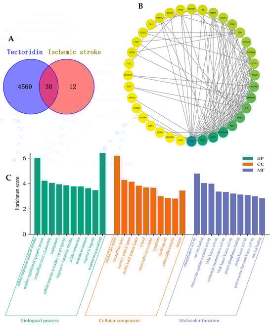 To explore the multiple targets and various pathways of tectoridin against ischemic stroke, we performed network pharmacology. First and foremost, we predicted the possible targets of tectoridin and obtained 101 potential related targets after eliminating the duplicates. Meanwhile, 4560 ischemic stroke-related targets were collected from the integration of Online Mendelian Inheritance in GeneCards, OMIM, PharmGkb, and DisGeNET databases. Finally, a total of 38 common protein targets of tectoridin and ischemic stroke were obtained (Figure 2A), which were subsequently input into the STRING 11.5 platform. Finally, a clearer protein–protein interaction (PPI) network diagram was depicted in Cytoscape software (version 3.8.0), including 38 main common nodes and 129 edges in total, with disconnected nodes being hidden (Figure 2B). At the same time, to reveal the functions of tectoridin in ischemic stroke treatment, we analyzed the biological process (BP), cellular component (CC), and molecular function (MF) in terms of the common targets with the Database for Annotation, Visualization and Integrated Discovery (DAVID). In total, 129 GO terms were significantly enriched (p < 0.05), including 80 BP terms, 17 CC terms, and 32 MF terms (Supplementary Table S1). The top 10 significantly enriched terms in the three categories are displayed visually (Figure 2C). The results showed that the main BP terms were extracellular matrix disassembly, apoptotic process, oxidative stress, response to xenobiotic stimulus; the main CC terms were extracellular region, secretory granule lumen, macromolecular complex, and cytoplasm; and the main MF terms were endopeptidase activity, enzyme binding, nitric-oxide synthase regulator activity, serine-type endopeptidase activity, MAP kinase kinase activity, and protein phosphatase binding.