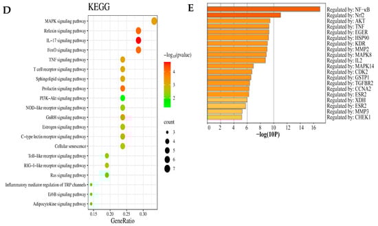 Protein–protein interaction (PPI) network and enrichment analysis of the anti-ischemic stroke mechanisms of tectoridin. (A) The 38 common targets of tectoridin and ischemic stroke. (B) PPI network plotting of main common targets. (C) GO enrichment analysis (the top 10 terms of BP, CC and MF enrichment analysis were shown in green, blue, and orange bars, respectively). (D) KEGG was significantly enriched in the top 20 pathways. (E) The protein enrichment analysis of tectoridin against ischemic stroke in TRRUST using Metascape (v3.5.20240901).