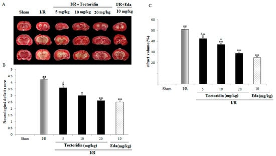 Tectoridin weakened the neurological deficits and infarct volume of ICR rat after I/R. (A) The impact of tectoridin on neurological deficits. (B) Representative brain sections after TTC staining. (C) The impact of tectoridin on infarct volume. ## p < 0.01, compared with the Sham group; * p < 0.05, ** p < 0.01 vs. I/R. Δ p < 0.05, ΔΔ p < 0.01, relative to the Eda group.