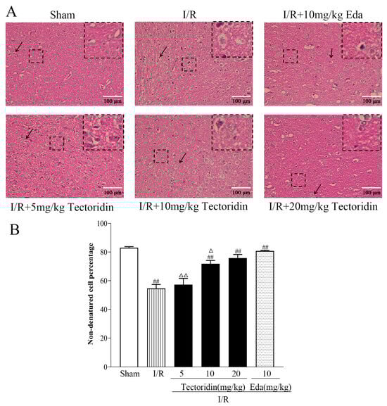 Neurological impairment was tested using a 5-point scale upon the occurrence of ischemic stroke, and higher scores reflected more severe motor impairment. The results are presented in Figure 4A. Rats in the sham cohort exhibited no neurological impairment; hence, the cohort had a constant neurological score of zero across the entire study. Related neurological impairment happened inside the I/R cohort (irregular posture and weaker spontaneous activity). The mentioned indicators received the remarkable relieving process inside the tectoridin cohort at 5, 10, and 20 mg/kg (p < 0.05, p < 0.05, p < 0.01) and Edaravone at 10 mg/kg (p < 0.01).