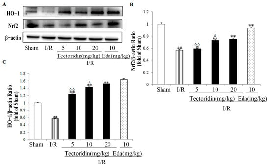 To examine how tectoridin affected Nrf2 and HO-1, this study further evaluated its protein levels in rat brain tissues. According to Figure 6, I/R remarkably decreased Nrf2 and HO-1 expressions relative to sham-operated control rats; comparatively, the I/R rats pretreated with tectoridin presented obviously increased Nrf2 and HO-1 levels relative to the I/R untreated rats.