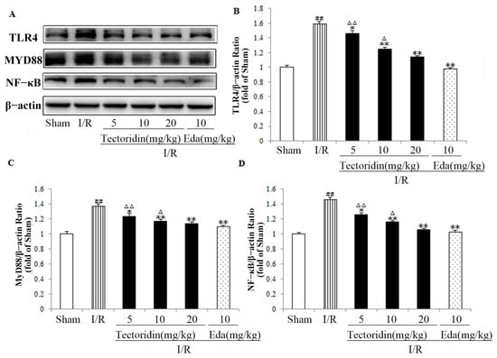 The TLR4/NF-κB signaling pathway serves as a fundamental pathway medicating the inflammation and remarkably impacts the ischemic injury of brains, hearts, and livers []. Without any stimulus, in the cytoplasm, NF-κB presents typical sequestering with IκB. Under stressful stimulation, through phosphorylation and deactivation of IκB kinase-β (IKKβ), IKBα releases NF-κB and translocates it to the nucleus as well as guiding many pro-inflammatory cytokines to transcript []. TLR4 assists in activating NF-κB via the MYD88-dependent pathway and MYD88-independent pathway, with the former stimulating the NF-κB to participate in the release of many inflammatory factors (TNF-α, interleukin-1 (IL-1), IL-6, and IL-8) []. For detecting whether tectoridin can resist inflammation via the TLR4/MYD88/NF-κB signaling pathway, this study focused on determining the expressions of TLR4, MYD88, and NF-κB at the protein level. As shown, the I/R group presented obviously increased protein expressions relative to the sham-operated rats, while tectoridin treatment led to obviously reduced expressions of the above indicators. The findings confirmed those of Niu et al., who revealed that tectoridin could modulate rats’ TLR4/NF-κB/NLRP3 signaling pathway to exert protective effects against the inflammatory response in inflammation induced by lipopolysaccharide [,]. Accordingly, tectoridin could inhibit the TLR4/MYD88/NF-κB signaling pathway, thereby decreasing the I/R-caused inflammatory response. Further experiments are needed to explore which aspect contributes more to the occurrence and development of cerebral I/R injury.