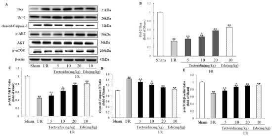 Effect of tectoridin on the PI3K/Akt signaling and the downstream proteins related to apoptosis. Western blot (A) and analysis of Bcl-2/Bax (B), p-Akt/Akt (C), cleaved Caspase-3 (D) and p-mTOR (E). Values are in the form of means ± SEM (n = 3). ## p < 0.01 considerably different from Sham; * p < 0.05, ** p < 0.01, considerably different from I/R; Δ p < 0.05, ΔΔ p < 0.01, relative to the Eda group.